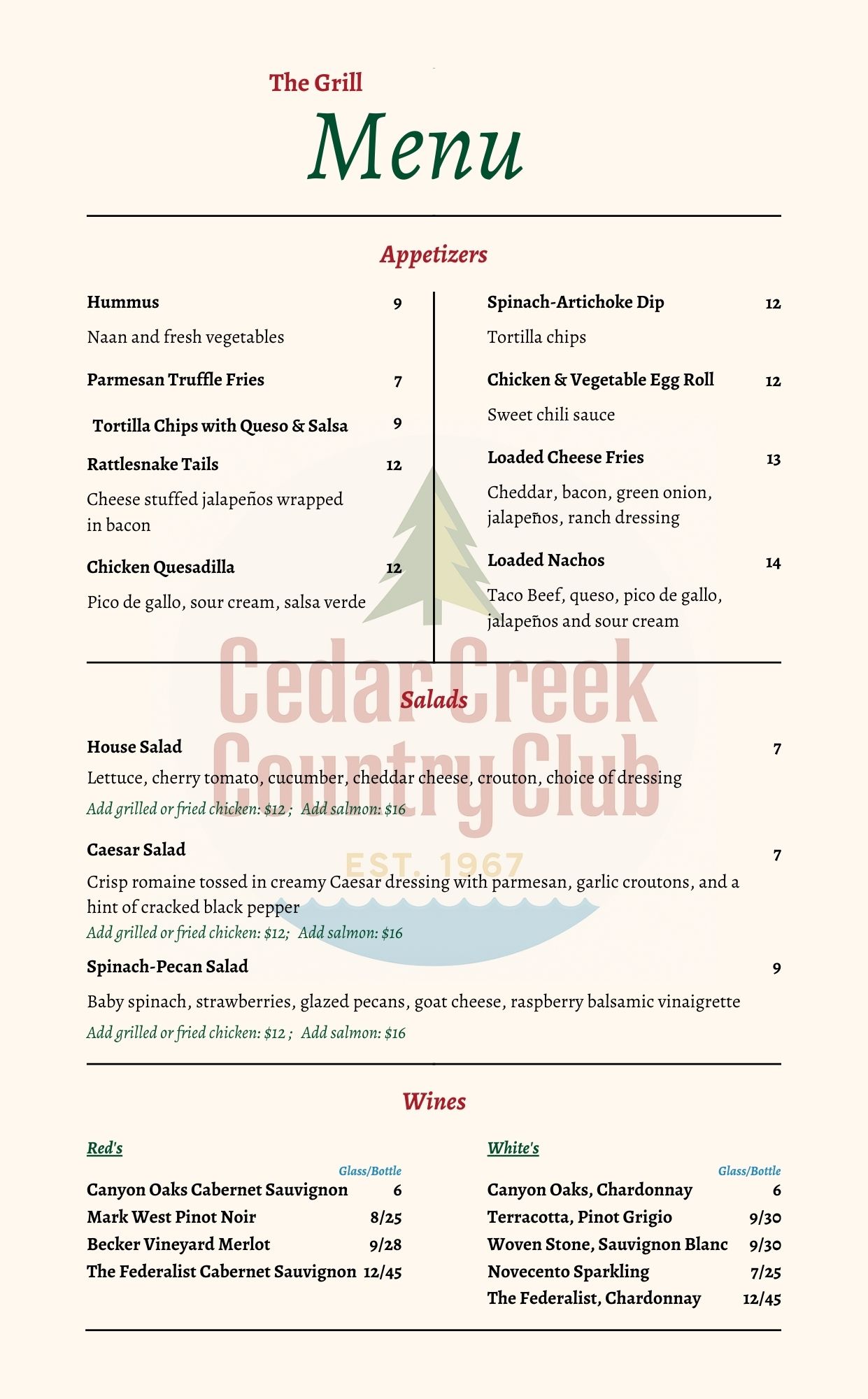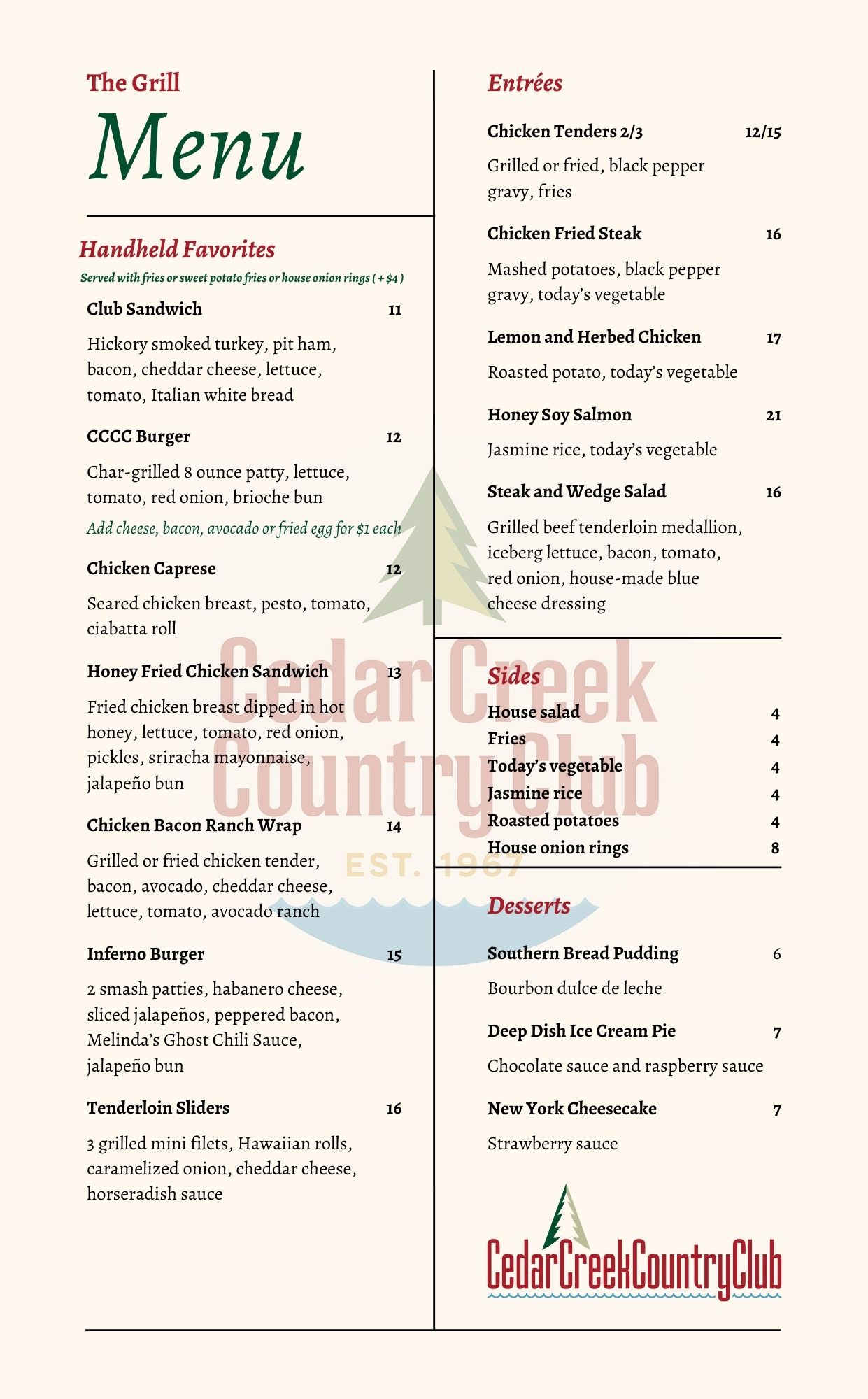 Dining at Cedar Creek Country Club is always something special. Not only do we serve delicious food and drinks six days a week, but our friendly, courteous team works hard to make every visit memorable.